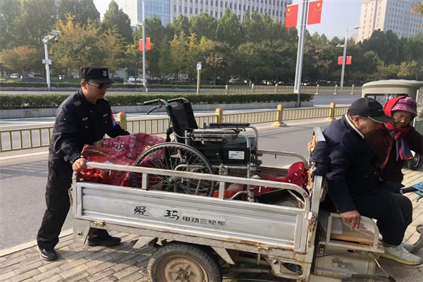 11月1日上午,特保隊員李志強在中院南門外發(fā)現(xiàn)有兩名信訪群眾身體不便前來中院上訪,他們年紀(jì)較大且腿腳不便,李志強耐心溝通了解后,主動上前攙扶并幫助他們把輪椅裝上三輪車,協(xié)助老人推動三輪車前去信訪大廳。